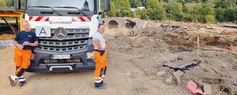 Ralf Zutz and Maik Nehls from EURAWASSER’s branch in Güstrow after a twelve-hour shift helping out in the flood-impacted region. They used their vacuum/cleaning truck to remove the mud and debris from the sewers in and around Ahrweiler